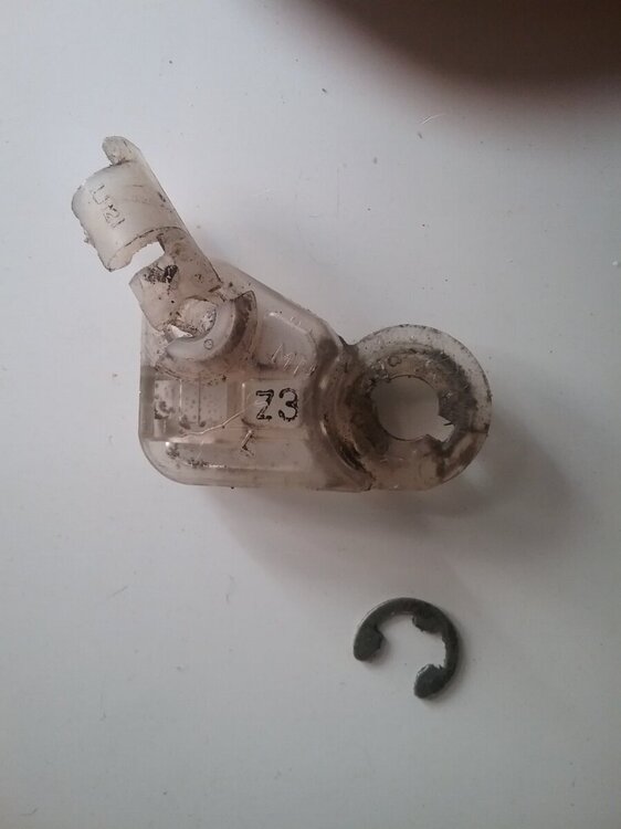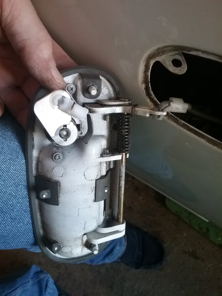 When replacing broken part part on end of key barrel, you need to .. Take door card off Take two nuts off back of handle FROM outside you can now carefully pull handle bolts out Which are part of door handle. At this point you can see both wire rods leave on for now and rotate handle90 degrees or so You now can get at broken plastic part , take rod out of this one leave the other in place What looks like a rivet on end of key barrel is in fact a E CLIP Use small screwdriver and release this Take broken bit off and clean end of barrel put new metal type on and refit E CLIP Now refit rod and rotate handle back to original position manoeuvre back into door Refit both nuts And test. Metal replacement was bought from CZP as a pair they sell new plastic clips also. About £20 Hope this helps