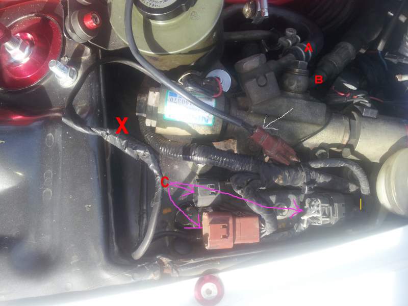 Hi Guys I am fitting skinz on the inner wings to tidy up the engine bay On the attached pic could someone just confirm..... I cut off the metal pipe B and attach it to rubber pipe A I can then remove the HICAS cylinders Does the other rubber pipe coming from the sterring fluid reservoir go to the clutch? The three unused connectors pointed at by the purple arrows C - are these redundant (to do with when car was an auto) and can I get rid of these connectors What is the other wire I labelled X? It attaches to a wire that is taped up with insulting tape which looks like some modification was made here. Any ideas? I was chatting with cheshire300zx (Paul) at Tatton last weekend and he was saying the best idea is to attach the skinz with Sikoflex. Any comments on that? Cheers Rich
