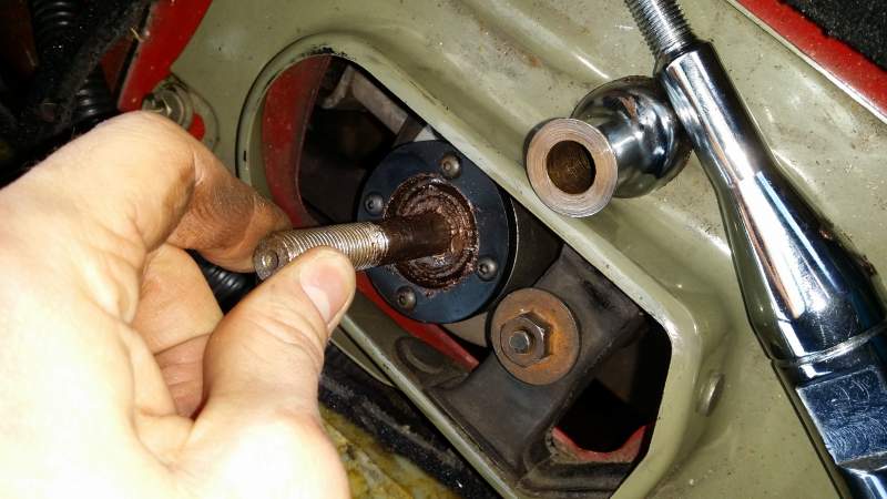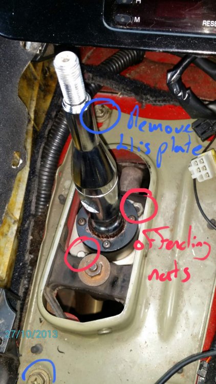 Yeah thanks Mark, I'll have a go tomorrow and report back. Just to help people in the future ill add a bit more information... New knob The chewed up old one sat a good inch taller once on. This means that the leather knob has less leverage and the shift feels short and heavy. Also 5th and reverse don't really go in anymore. This must have always been a problem but the extra leverage masked it. Kev helped here by advising I try the old knob with it all exposed and the old successful shifting returned. Mark and I discussed this and he explained that the problem probably does not exist inside the short shifter unit itself as I thought. But rather is a clearance issue at the other end of those red circled bolts. On one side the 5th reverse side. I will remove the olive plate (blue circles) and have a look and an adjust tomorrow.