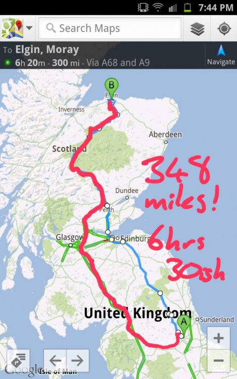 I haven't got exact figures yet but I just got to Elgin on a single tank. 348miles on a tank! Now I normally hate miles per tank but as I couldn't afford to brim the tank again at this end it will have to do. I filled the tank with momentum 99 as I set off and started the trip meter. I decided at Stirling when I had exactly half a tank after 180 miles that I was doing it on one tank or pushing. Now with about 40 miles to go in the middle of lord of the rings I passed a rare petrol station with a fuel tank a woman would call empty. By the time I had 10 miles to go even I thought it was empty but I got to Elgin Tescos after 148 miles. I'll just crunch some numbers but that has to be good, 90 quid of momentum 99 to go this far. A lot of it at nearly 80 and a lot on single carriageway. Oh! And the car contained among other things, a fridge full of papers a 48inch TV and a lot of bags.