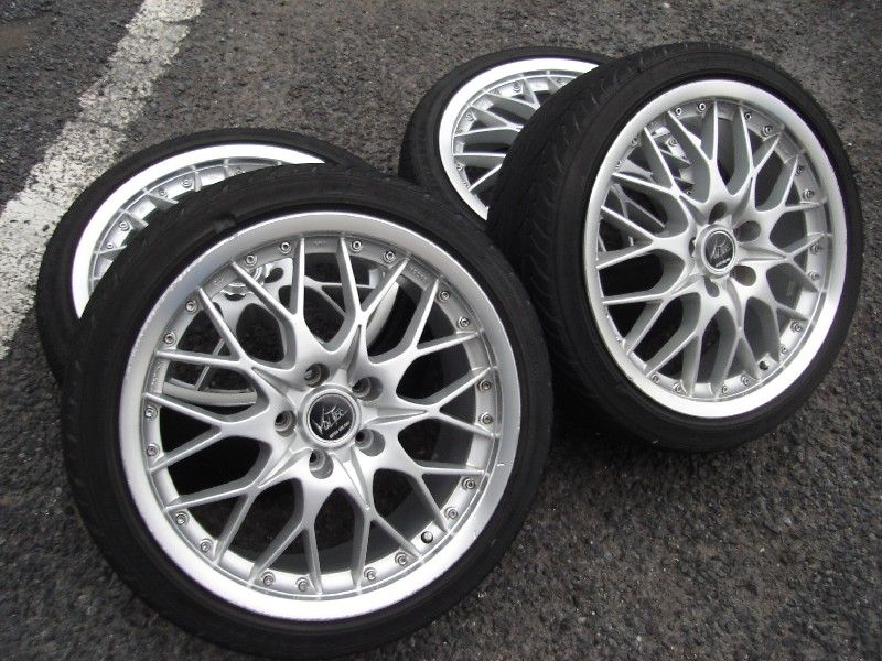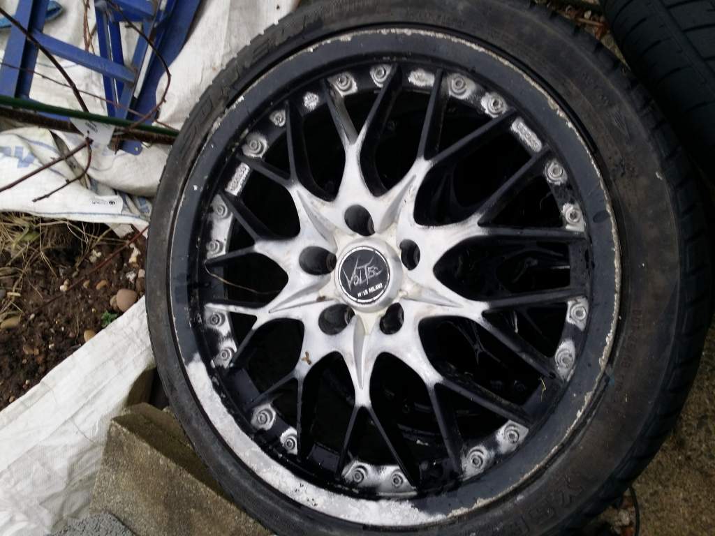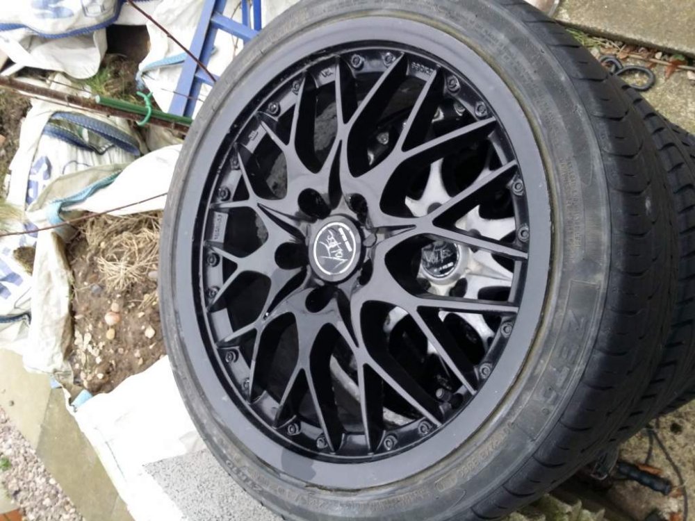 These came with the Stagea but I replaced them with the 350z wheels. I did start sand blasting them clean but never got round to finishing them, one was quickly blown over with black rattle can to test the colour. Wheels are free of cracks, tyres have lots of tread but are cheap nasty chinese rubber and are so old they're cracking so not fit for road use. 225/45/18 tyres front and back and brand new bore adapters to bring them to standard nissan fitting, pcd is correct and sit nicely. Clearing up the garden so £150 and buyer to pickup with cash in hand and they will look great on a zed. (The last picture is what they SHOULD look like when refurbished)