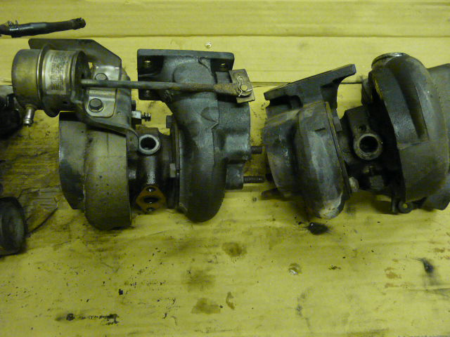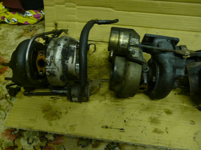 I have removed my turbos off the engine today ready to send off to be refurbed. I have a standard pair of auto ones off the breaker I had, which we were going to use to get refurbed then put on my car, but company I am using said could not do auto tubs!!! I thought there was a physical difference between auto and manwell tubs, but as the pictures show these look identical!! My 2 are on the right the one off my breaker is on the left.