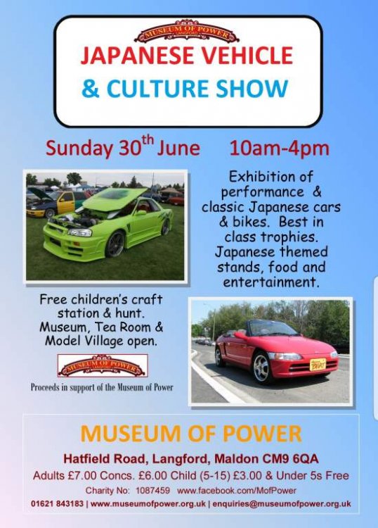 Hi all.. I have arranged a club stand at the 2019 Japanese matsuri at the museum of power in langdon, maldon. We currently have a 10 car stand booked, entry for displaying vehicles and occupants is free and i am looking for owners who would like to attend and put their car on the stand. The event venue has wntertainment for families so if you want to bring the family for a day out, there will be things to occupy the kids. Could really do with some support for this event and stand space will be first come first served. Should we reach the max number for the stand early enough we have the opportunity to increase stand space, so i would appreciate you guys letting me know as soon as possible if you would like to attend. Thank you. Details of the event can be found on the website.