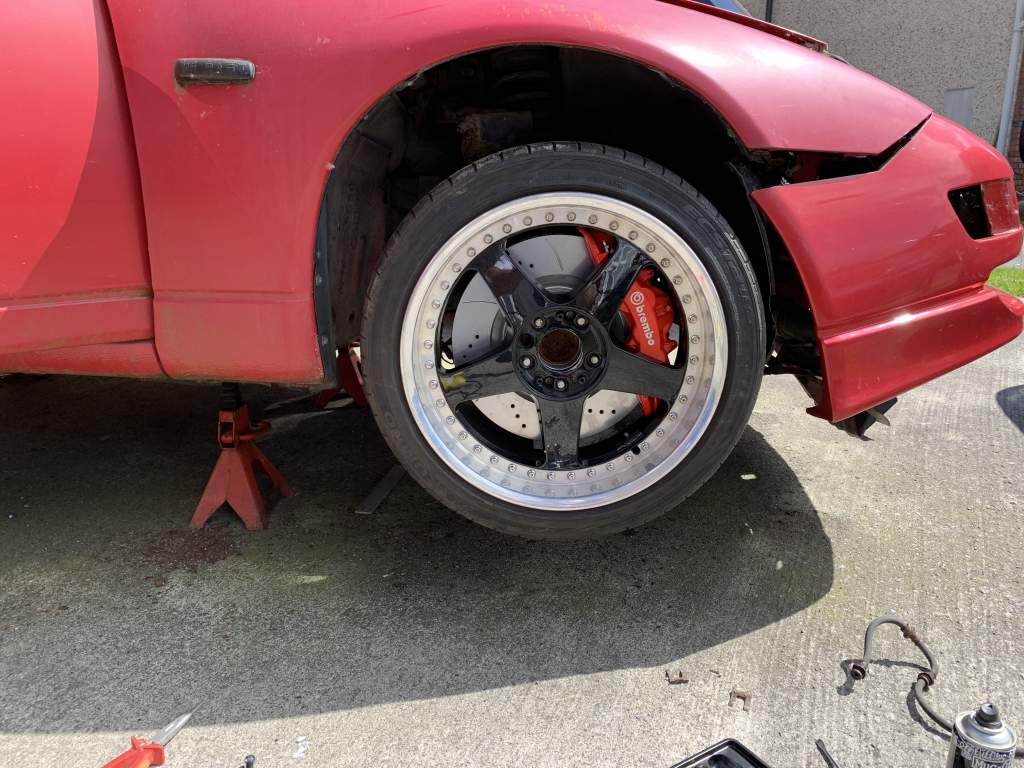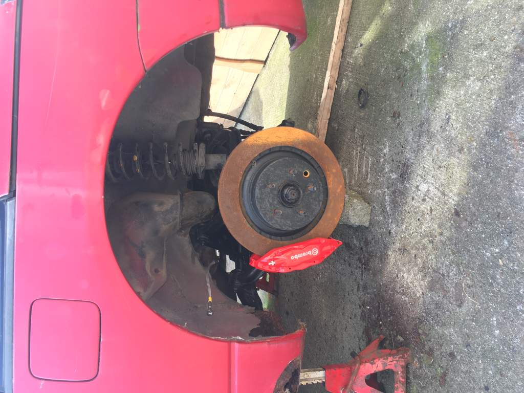Had a few days off, so back at Project Red, finally rebuilt my Brembo 8 pots last night :clap: This morning I had a couple of free hours and got stuck in to fitting :thumbup: Think they look savage behind the black Veilsides:punk: