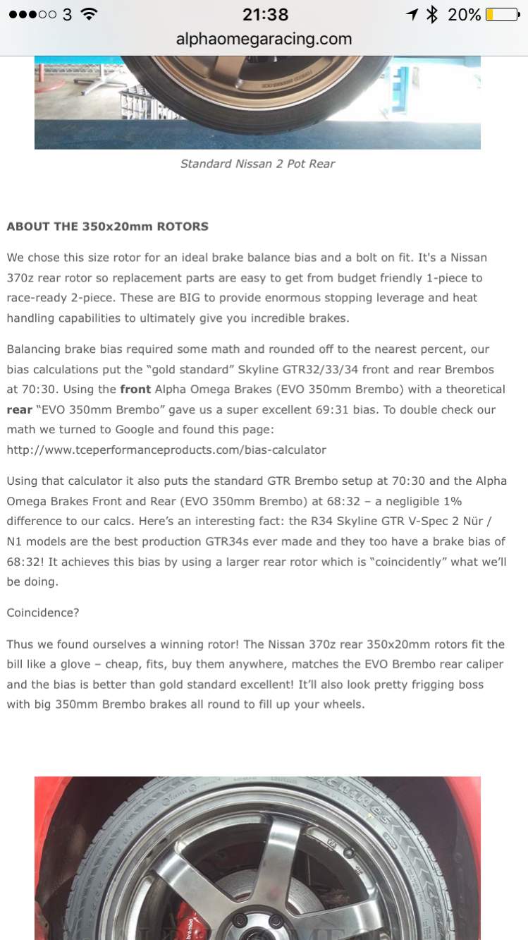 When you match up the Brembo rears you get a very similar brake bias (69:31) to that of the R34 GTR (70:30)there's a write up on Alpha Omega in Australia.